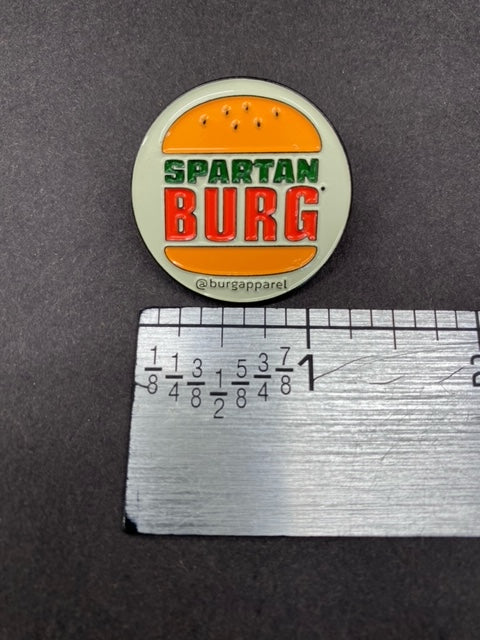 Metal pin with colored front. Featuring our classic Spartan Burg logo and Hamburger bun. measures about 1 inch around